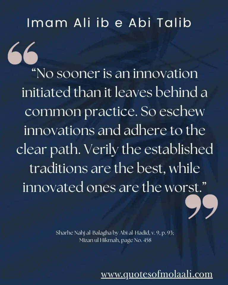 This saying of Imam Ali (a.s.) teaches that when people introduce new innovations in religion or life, they often abandon the true and authentic ways. Imam Ali (a.s.) advises to stay away from such innovations and remain steadfast on the clear and rightful path, for the original and established traditions are the best source of guidance.