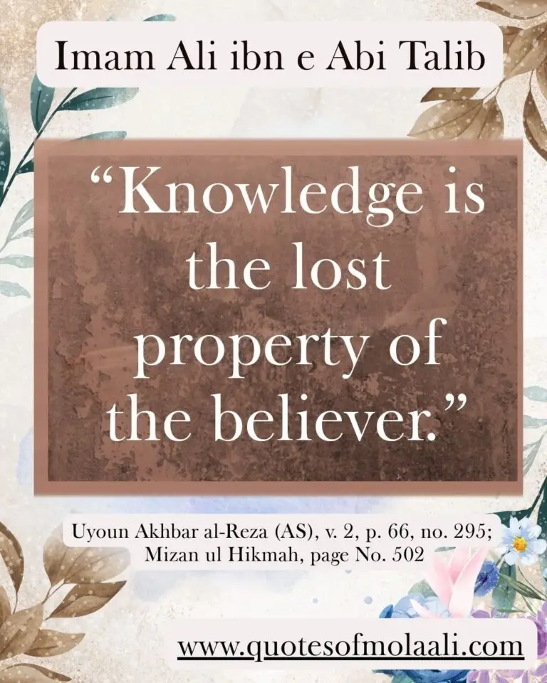 This quote by Mola Ali (a.s.) means that a true believer values knowledge wherever it is found. Just like a person reclaims lost property, a believer should seek knowledge from any source, without pride or prejudice. For the wise, knowledge is a divine inheritance that must be recovered and used for good.