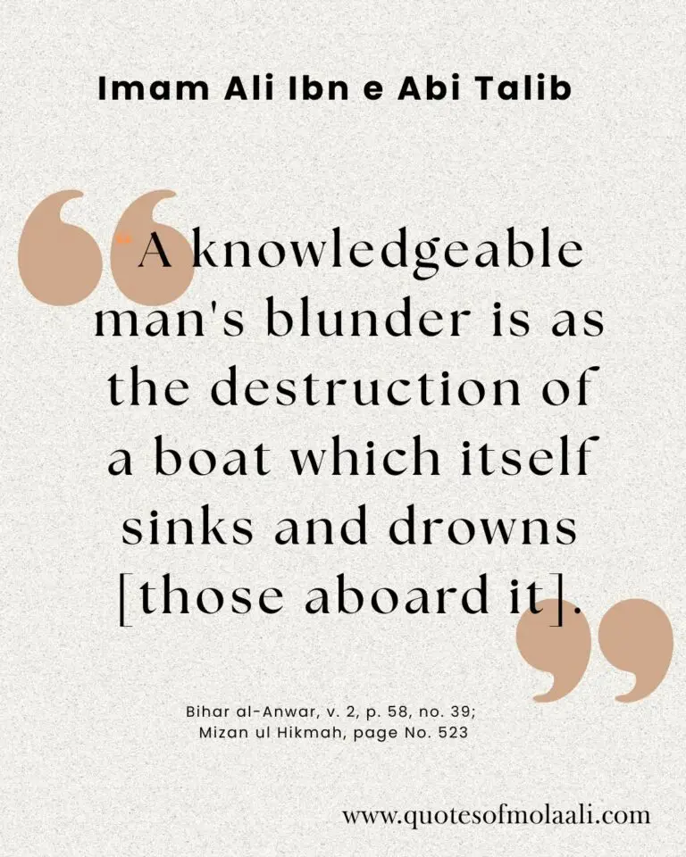 امام علی ابنِ ابی طالب  فرماتے ہیں:” ایک عالِم آدمی کی لغزش ایسے ہے جیسے کسی کشتی کی تباہی، جو خود بھی ڈوب جاتی ہے اور اپنے ساتھ سواروں کو بھی غرق کر دیتی ہے”۔