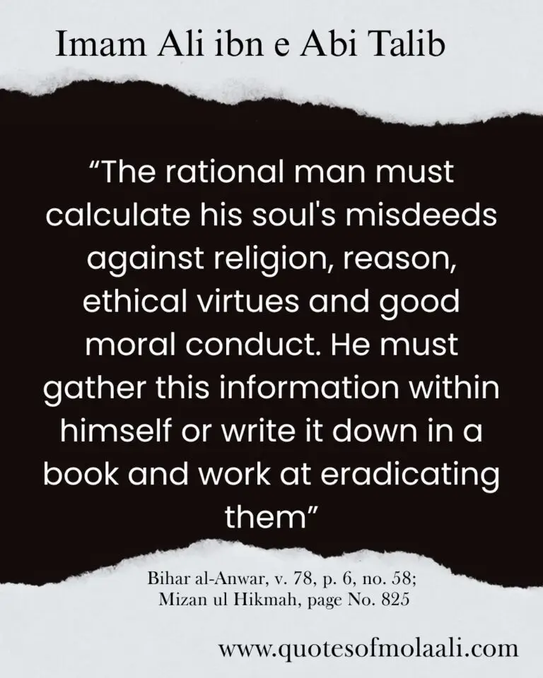 This quote by Mola Ali (a.s.) teaches the importance of self-accountability. A wise person regularly examines his actions, comparing them with the values of faith, reason, and good morals. By recognizing and recording his faults, he can work sincerely to purify his soul and become a better human being.