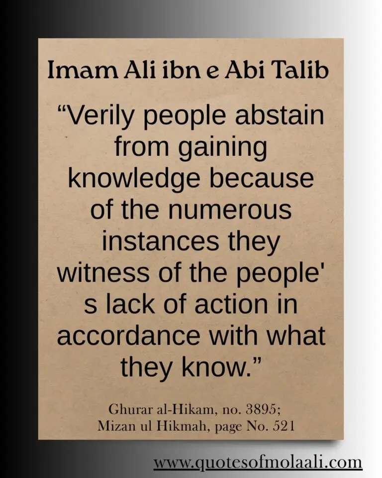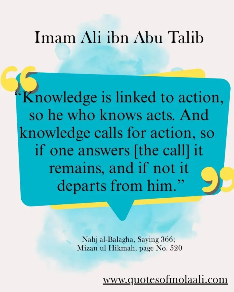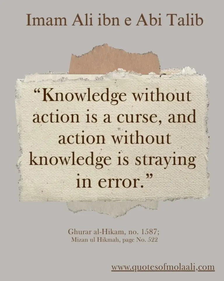 مولا علی  فرماتے ہیں  – “علم عمل کے ساتھ جڑا ہوا ہے، لہٰذا جو شخص جانتا ہے وہ عمل بھی کرتا ہے، اور علم عمل کی طرف بلاتا ہے، پس اگر کوئی اس پکار کا جواب دے تو علم اس کے پاس برقرار رہتا ہے، اور اگر جواب نہ دے تو علم اس سے رخصت ہو جاتا  ہے
